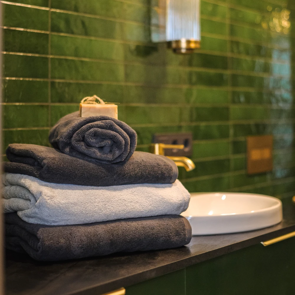 Die Handtücher sind aufgrund ihres strapazierfähigen Aufbaus sehr besonders. Das Verweben von zwei Garnen zusammen schafft ein stärkeres Gewebe, das Feuchtigkeit effizient aufnimmt, während es dennoch weich auf der Haut bleibt.